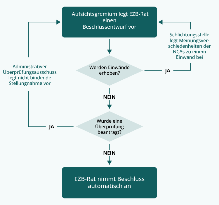 Das Aufsichtsgremium bereitet Beschlussentwürfe vor, die anschließend vom EZB-Rat nach dem Verfahren der impliziten Zustimmung angenommen werden. Sofern der EZB-Rat nicht innerhalb eines vorgegebenen Zeitraums Einwände erhebt, gilt der Beschluss als erlassen.
