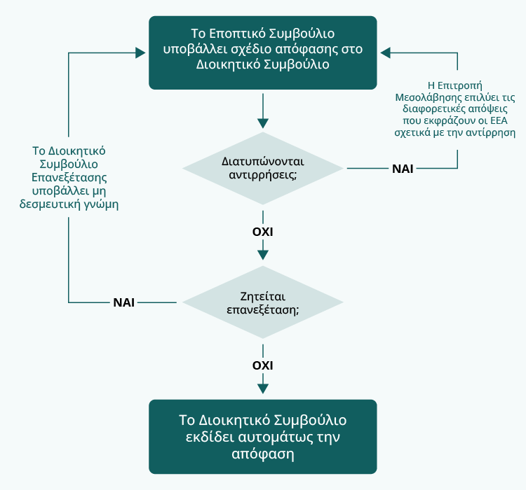 Το Εποπτικό Συμβούλιο συντάσσει σχέδια αποφάσεων, τα οποία στη συνέχεια εκδίδονται από το Διοικητικό Συμβούλιο στο πλαίσιο διαδικασίας μη διατύπωσης αντίρρησης. Εάν το Διοικητικό Συμβούλιο δεν διατυπώσει αντίρρηση εντός καθορισμένης χρονικής περιόδου, τότε η απόφαση θεωρείται ότι έχει εγκριθεί.