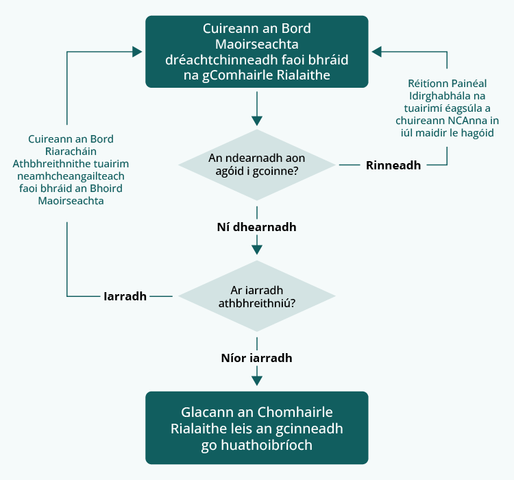 Tá réasúnaíocht shoiléir ina leagtar amach na fíorais ábhartha, cúiseanna dlíthiúla agus na breithnithe maoirseachta is bonn leis an gcinneadh ag gabháil lenár gcinntí maoirseachta.