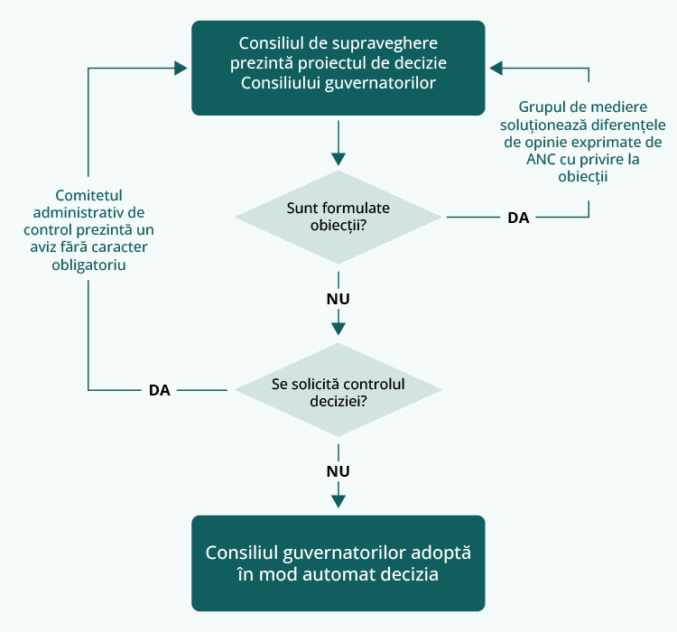 Consiliul de supraveghere elaborează proiecte de decizii, care sunt adoptate ulterior de Consiliul guvernatorilor în cadrul unei proceduri aplicabile în cazul absenței unei obiecții. În cazul absenței unei obiecții din partea Consiliului guvernatorilor într-un interval definit, decizia este considerată adoptată.