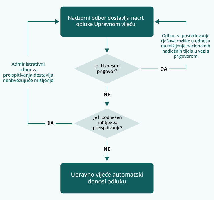 Nadzorni odbor priprema nacrt odluke koju Upravno vijeće potom donosi u skladu s postupkom neisticanja prigovora. Ako Upravno vijeće ne iznese prigovor u određenom roku, odluka se smatra donesenom.