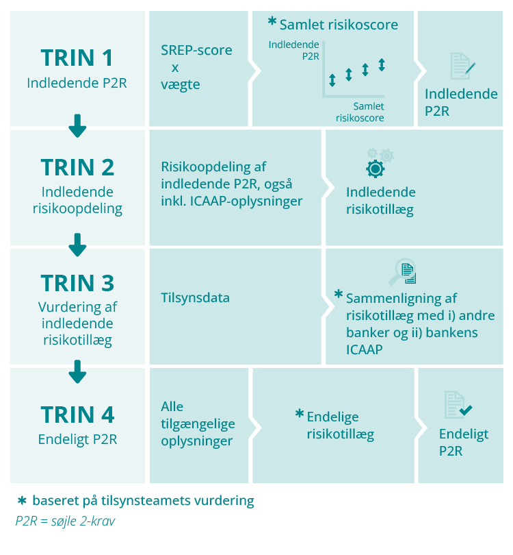 I denne cyklus anvendte ECB Banktilsyn en firetrinsmetode til at fastsætte søjle 2-kravet for de enkelte banker, med en vurdering for hver enkelt risiko. Alle de fire trin var lige vigtige. Tilsammen resulterede de i et indledende, holistisk søjle 2-krav, der er baseret på en samlet vurdering af bankens risikoprofil, og som senere kombineredes med en mere dybdegående analyse af de enkelte risikofaktorer for at få det endelige søjle 2-krav for hver enkelt risiko.