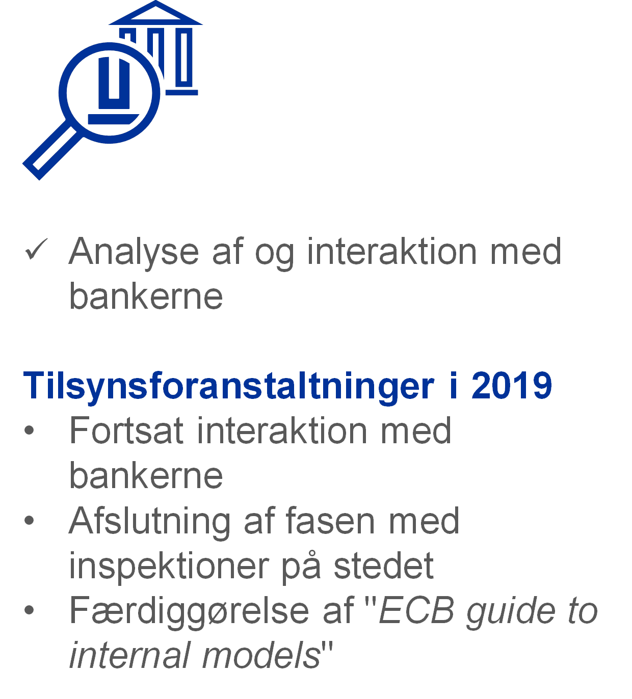 Den målrettede gennemgang af interne modeller, TRIM, fortsætter i 2019 med det overordnede mål at reducere ubegrundede variationer i vurderingen af risikovægtede aktiver og bekræfte, at bankernes godkendte søjle 1-interne modeller er tilstrækkelige. I løbet af 2019 har ECB Banktilsyn til hensigt at fortsætte sine TRIM-relaterede undersøgelser på stedet, hvor det primære fokus er på de modeller, der anvendes til at vurdere kreditrisikoen for eksponeringer mod mellemstore/store erhvervsvirksomheder og institutter samt specialiseret långivning. ECB Banktilsyn vil udføre horisontale analyser af de færdige undersøgelser og indlede udarbejdelsen af en endelig projektrapport. Desuden er det planen at opdatere den nuværende "ECB guide to internal models".