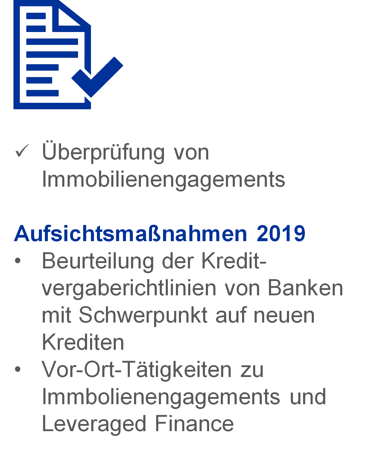 Die EZB-Bankenaufsicht wird die Qualität der Kreditvergaberichtlinien der Banken, insbesondere im Hinblick auf neue Kredite, beurteilen. Sie wird die Qualität der Kreditvergabeverfahren und -standards von Banken überprüfen, um mögliche Risiken zu mindern. Hieraus können bankspezifische Maßnahmen resultieren. Zudem wird die Bankenaufsicht die Qualität von Engagements in bestimmten Anlageklassen im Rahmen von speziellen Vor-Ort-Prüfungen in Bereichen wie beispielsweise Gewerbeimmobilien, Wohnimmobilien und Leveraged Finance untersuchen.