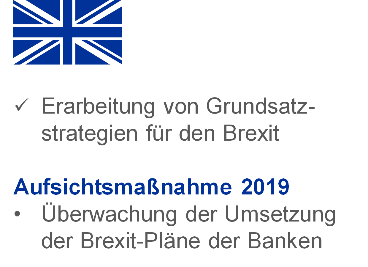 Zu den für 2019 geplanten Aufsichtstätigkeiten zur Bewältigung mehrerer Risikodimensionen gehören die laufenden Vorbereitungen auf den Brexit sowie Arbeiten zu Handelsrisiken und zur Bewertung von Vermögenswerten.
