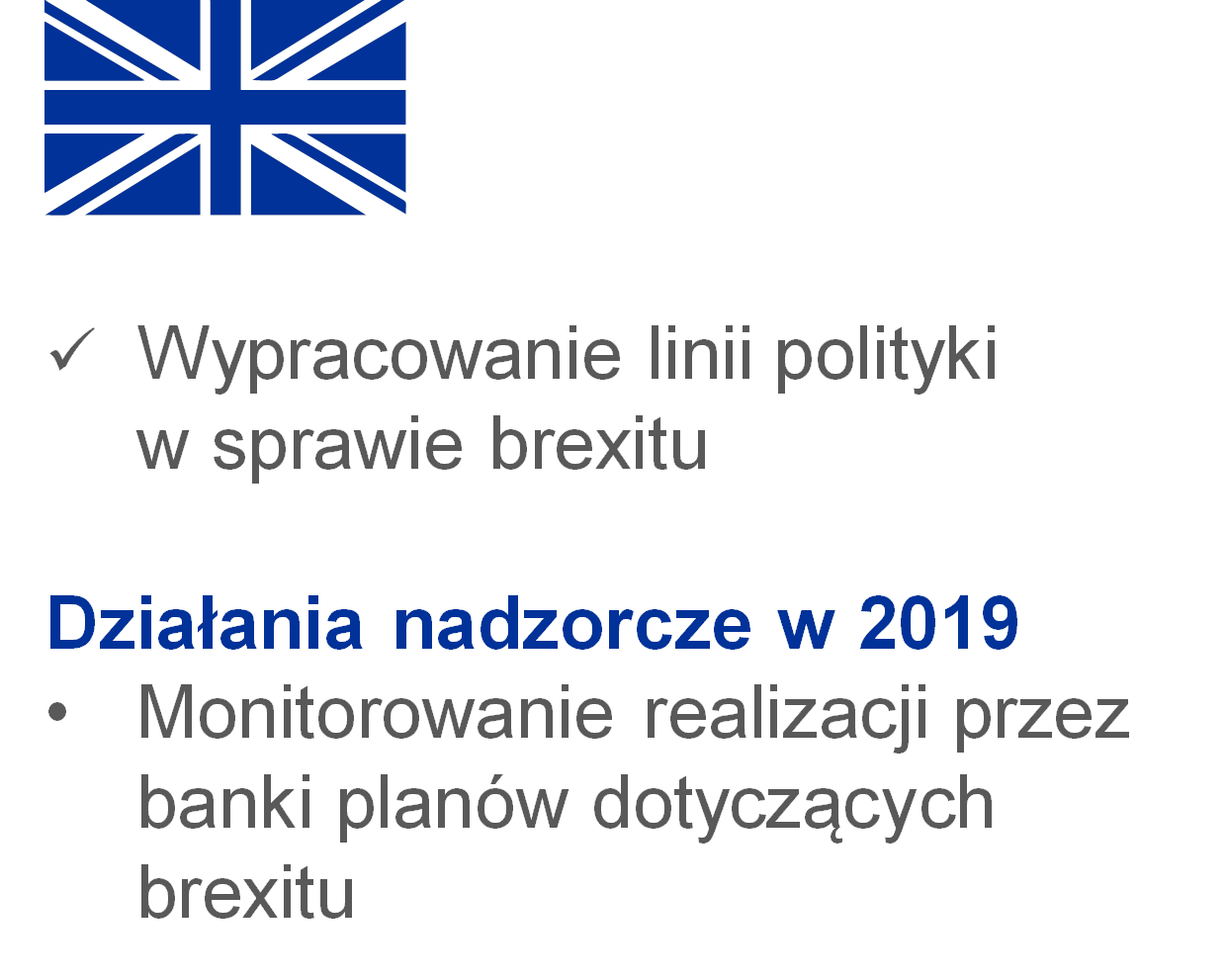 Przygotowanie banków na wyjście Wielkiej Brytanii z Unii Europejskiej, które ma nastąpić w marcu 2019, pozostaje jednym z priorytetów Nadzoru Bankowego EBC. Nadzorcy będą ściśle monitorować realizację planów banków związanych z brexitem, aby zapewnić ich zgodność z oczekiwaniami nadzorczymi. Działania te będą zależeć od rezultatów politycznych negocjacji i decyzji o wprowadzeniu (bądź niewprowadzaniu) okresu przejściowego. Z uwagi na utrzymującą się niepewność Nadzór Bankowy EBC podkreśla, że banki muszą liczyć się z każdą ewentualnością i kończyć już swoje przygotowania. EBC z kolei będzie kontynuować przygotowania do przejęcia bezpośredniego nadzoru nad instytucjami, które niedawno uzyskały status istotnych, ponieważ w związku z brexitem przeniosły działalność z Wielkiej Brytanii do państwa objętego jednolitym mechanizmem nadzorczym.