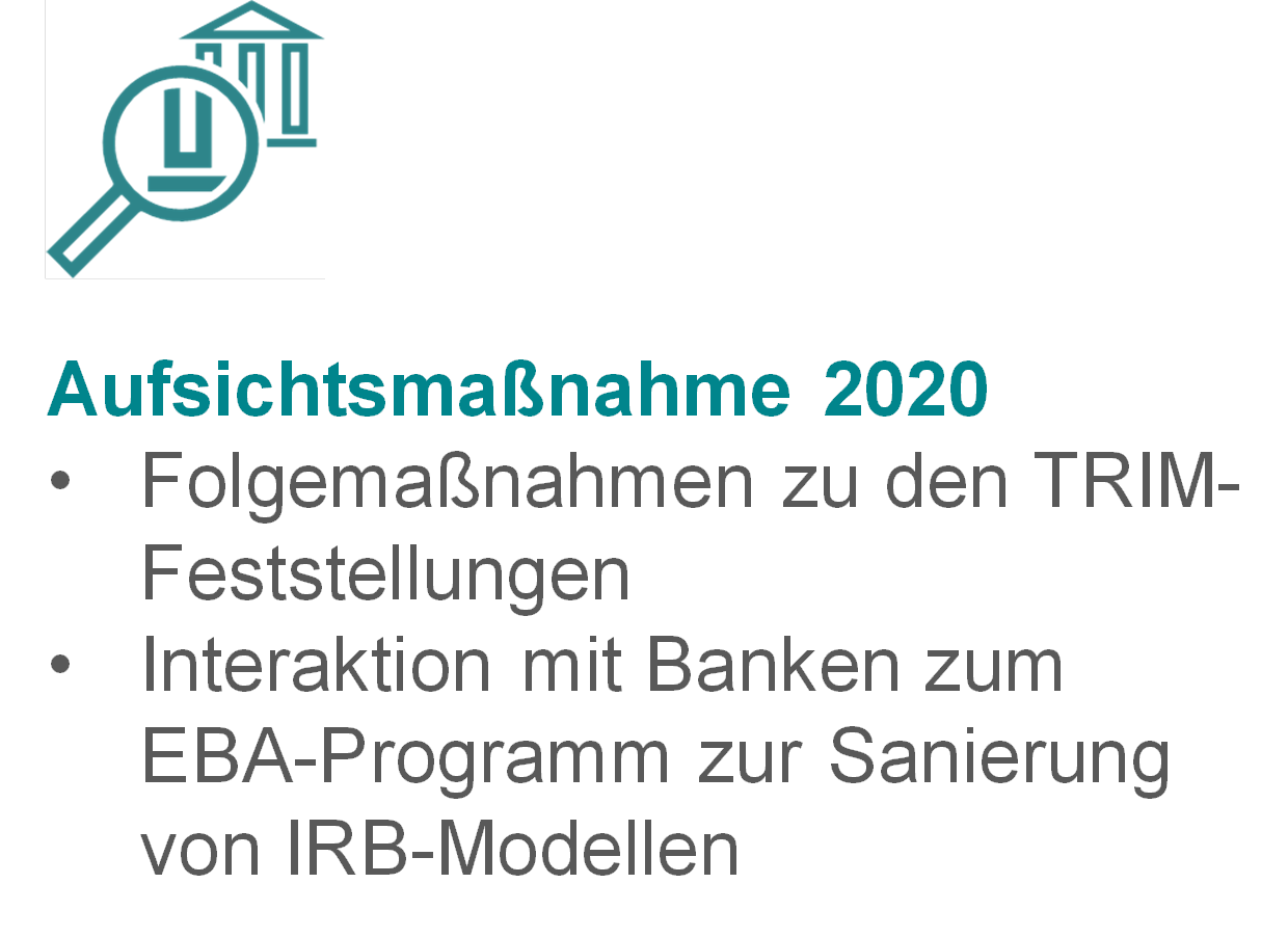 Es wird weiter daran gearbeitet, die Angemessenheit der von den Banken zur Berechnung ihrer regulatorischen Kapitalanforderungen verwendeten internen Modelle zu gewährleisten. Nach den im Rahmen der gezielten Überprüfung interner Modelle (Targeted Review of Internal Models – TRIM) erfolgten Vor-Ort-Prüfungen liegt der Schwerpunkt auf der Beseitigung der festgestellten Mängel. Außerdem sind erhebliche Aufsichtstätigkeiten für die Kreditrisikomodelle der Institute erforderlich, um den Anforderungen des Programms der Europäischen Bankenaufsichtsbehörde zur Sanierung von IRB-Modellen[2] Rechnung zu tragen.
