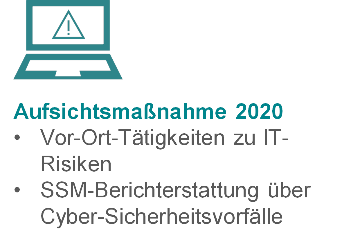 Die EZB-Bankenaufsicht wird die IT- und Cyberrisiken für Banken weiterhin im Rahmen von Vor-Ort-Prüfungen und durch eine Überwachung dieser Risiken im Rahmen des aufsichtlichen Überprüfungs- und Bewertungsprozesses (Supervisory Review and Evaluation Process – SREP) beurteilen. Außerdem werden bedeutende Banken im Rahmen der SSM-Berichterstattung über Cyber-Sicherheitsvorfälle nach wie vor alle schwerwiegenden Cyber-Sicherheitsvorfälle an die EZB melden.