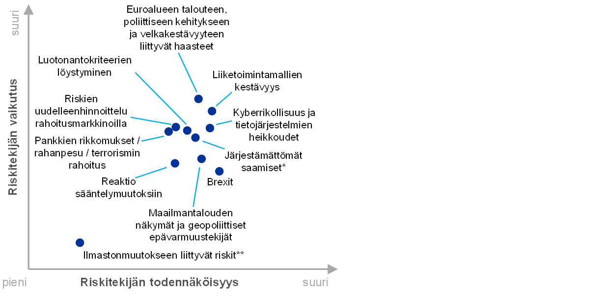 Euroalueen pankkijärjestelmän kolme tärkeintä riskitekijää kolmen vuoden sisällä ovat 1) Euroalueen talouteen, poliittiseen kehitykseen ja velkakestävyyteen liittyvät haasteet, 2) pankkien liiketoimintamallien kestävyys sekä 3) kyberrikollisuus ja tietojärjestelmien heikkoudet. Muita merkittäviä riskitekijöitä ovat järjestämättömiä saamisia koskevien strategioiden toteutusriski, luotonantokriteerien löystyminen, riskien uudelleenhinnoittelu rahoitusmarkkinoilla, pankkien rikkomukset / rahanpesu / terrorismin rahoitus, brexit, maailmantalouden näkymät ja geopoliittiset epävarmuustekijät, pankkien reaktiot sääntelyyn sekä ilmastonmuutokseen liittyvät riskit. Euroalueen talouteen liittyy enemmän riskejä kuin edellisvuonna. Suhdannekehitys on saavuttamassa taitekohtansa ja maailmantalouden näkymät ovat heikentyneet muun muassa pitkittyneen epävarmuuden ja protektionismiuhan seurauksena. Lisäksi korkotason odotetaan pysyvän edelleen matalana, mikä ei sekään vähennä euroalueen pankkien vaisuun kannattavuuteen ja niiden liiketoimintamallien kestävyyteen liittyviä huolia. Rahanpesutapauksiin kiinnitetään yhä enemmän huomiota, mikä kasvattaa toimintatapariskiä.