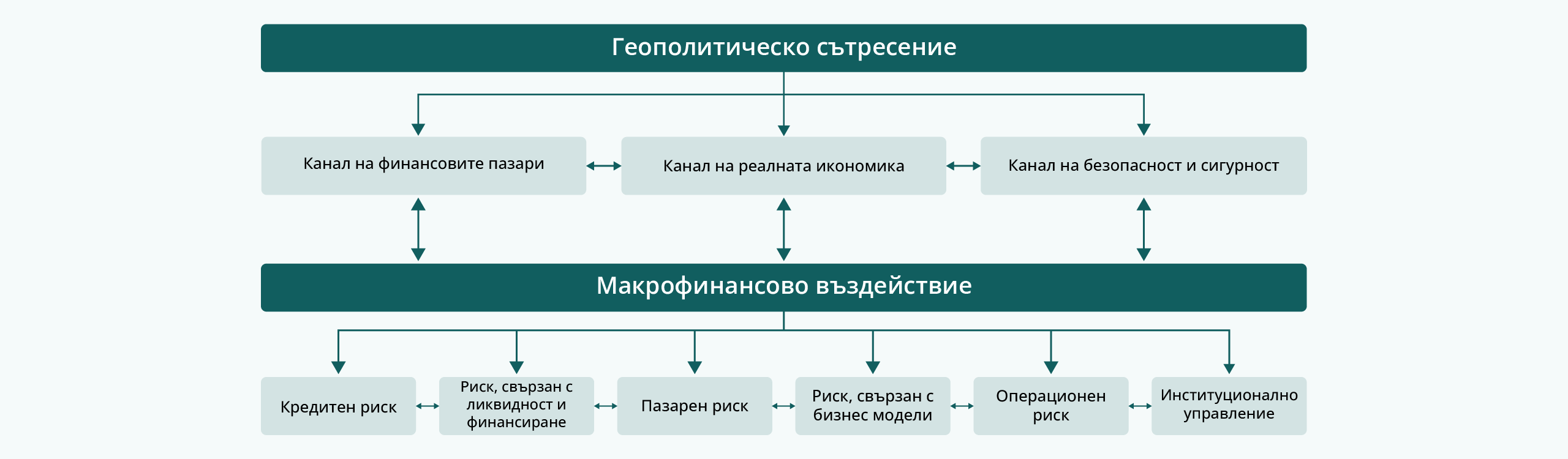 Геополитически рискове могат да се предадат към банките по линия на кредитния, ликвидния и свързания с финансирането риск, пазарния риск, риска, свързан с бизнес модела, операционния риск и институционалното управление. Затова се очаква банките да вземат предвид и геополитическите рискове, когато идентифицират и управляват своите. Важно е да се отбележи, че излагането на геополитически риск не се ограничава само до банки с пряко международно въздействие. По-малките банки също могат да бъдат засегнати непряко – чрез техните корпоративни клиенти, зависимостта от международните капиталови пазари или споразуменията за възлагане на дейности на външни изпълнители, особено за ИКТ и услуги в облак, които са съсредоточени в няколко глобални доставчици.