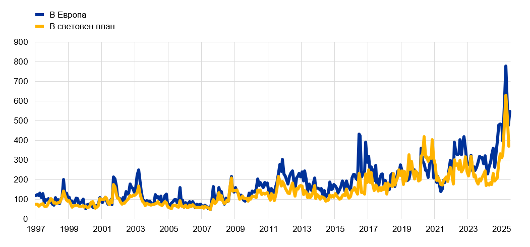 Забележки: Индексът е основан на новини и обхваща несигурността по отношение на икономическата политика, като се отчита броят на статиите от вестници, съдържащи понятията „несигурен“ или „несигурност“, „икономически“ или „икономика“, както и едно или повече свързани с политиката понятия. Данните са за периода от януари 1997 г. до август 2025 г. за индекса на несигурност по отношение на икономическата политика в Европа и за периода от януари 1997 г. до юли 2025 г. за глобалния индекс. Европейският индекс се основава на данни от вестници във Франция, Германия, Италия, Испания и Обединеното кралство. Глобалният индекс представлява среднопретеглена стойност на БВП (по текущи цени) от националните индекси на несигурност по отношение на икономическата политика за: Австралия, Бразилия, Канада, Чили, Китай, Франция, Германия, Гърция, Индия, Ирландия, Италия, Япония, Русия, Южна Корея, Испания, Швеция, Обединеното кралство и САЩ.