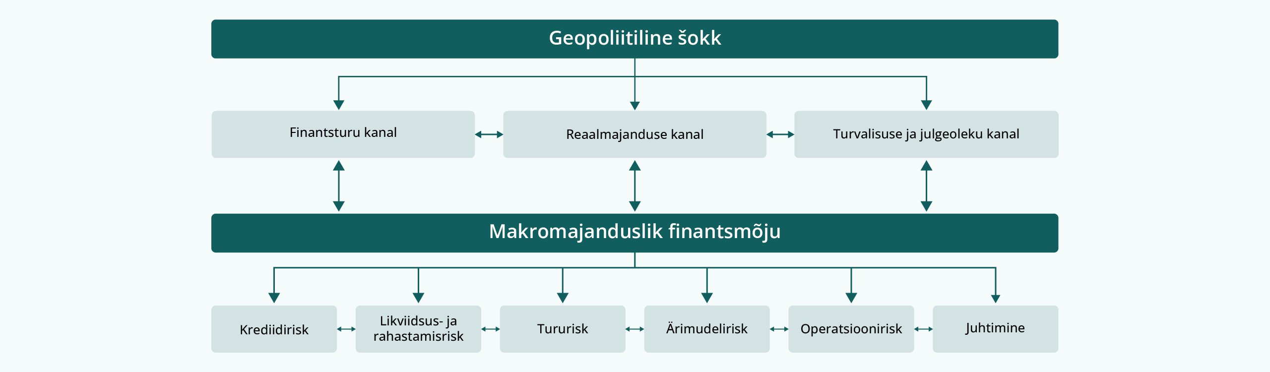 Geopoliitilised riskid võivad realiseeruda krediidi-, turu-, operatsiooni- ja rahastamisriskidena. Geopoliitilised šokid võivad pankadele ja nende tegevuskeskkonnale üle kanduda eri kanalite kaudu.