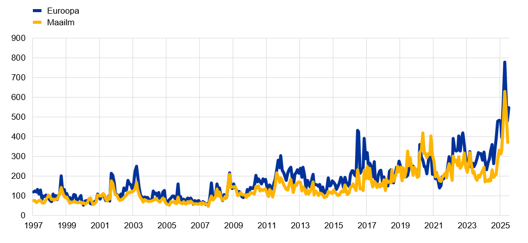 Märkus. Uudispõhine indeks kajastab majanduspoliitikaga seotud ebakindlust, võttes aluseks ebakindluse ja majanduse mõistet ning ühte või mitut poliitika seisukohalt olulist mõistet sisaldavate ajaleheartiklite arvu. Euroopa majanduspoliitikaga seotud ebakindluse indeksi andmed pärinevad 1997. aasta jaanuarist kuni 2025. aasta augustini ning üleilmse majanduspoliitikaga seotud ebakindluse indeksi andmed 1997. aasta jaanuarist kuni 2025. aasta juulini. Euroopa indeks põhineb Hispaania, Itaalia, Prantsusmaa, Saksamaa ja Ühendkuningriigi ajalehtedes avaldatud materjalidel. Üleilmne indeks on riikide majanduspoliitika ebakindluse indeksite SKPga kaalutud (jooksevhindades) keskmine ning hõlmab järgmisi riike: Ameerika Ühendriigid, Austraalia, Brasiilia, Hiina, Hispaania, Iirimaa, India, Itaalia, Jaapan, Kanada, Kreeka, Lõuna-Korea, Prantsusmaa, Rootsi, Saksamaa, Tšiili, Venemaa ja Ühendkuningriik.