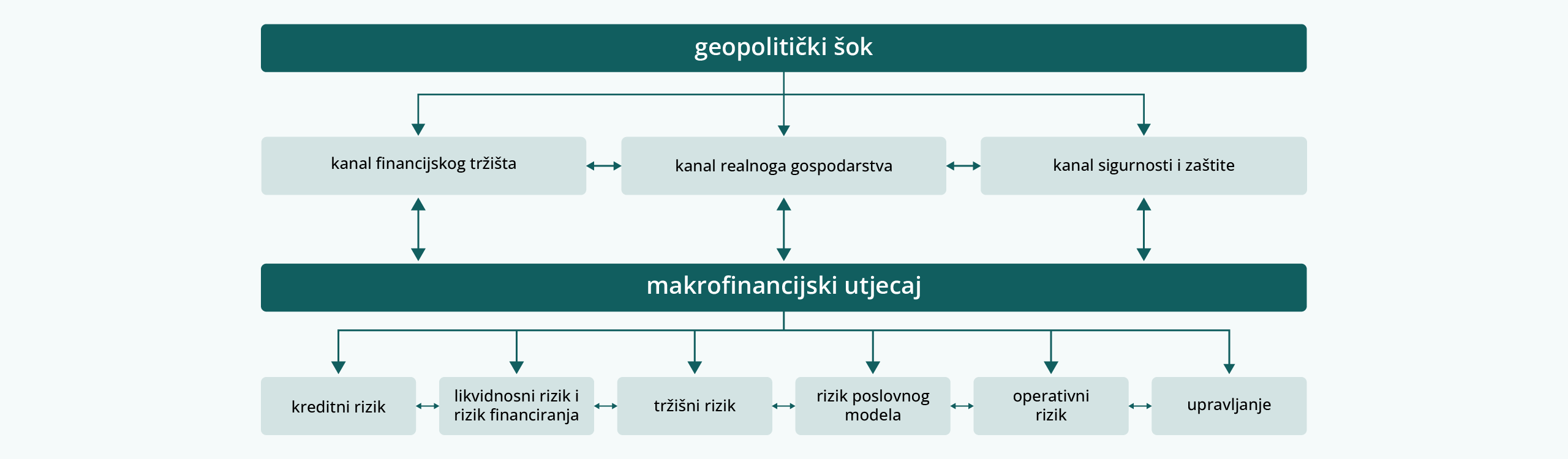 Geopolitički rizici mogu se ostvariti kao kreditni, tržišni, operativni rizik ili rizik financiranja. Geopolitički šokovi različitim se kanalima prenose na banke i njihovo poslovno okružje.