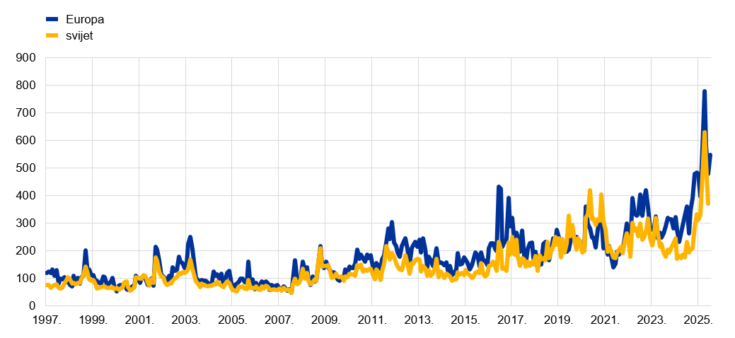 Napomene: Indeks se zasniva na vijestima. Neizvjesnost povezana s ekonomskom politikom mjeri se brojanjem novinskih članaka koji sadržavaju izraze neizvjestan ili neizvjesnost, gospodarski ili gospodarstvo te jedan ili više izraza koji su važni za ekonomsku politiku. Podatci su za razdoblje od siječnja 1997. do kolovoza 2025. za indeks neizvjesnosti u Europi a za razdoblje od siječnja 1997. do srpnja 2025. za indeks neizvjesnosti u svijetu. Indeks za Europu zasniva se na novinama iz Francuske, Njemačke, Italije, Španjolske i Ujedinjene Kraljevine. Indeks za svijet prosječna je vrijednost ponderirana BDP‑om (po tekućim cijenama) nacionalnih indeksa neizvjesnosti povezane s ekonomskom politikom za Australiju, Brazil, Čile, Francusku, Grčku, Indiju, Irsku, Italiju, Japan, Južnu Koreju, Kanadu, Kinu, Njemačku, Rusiju, Sjedinjene Američke Države, Španjolsku, Švedsku i Ujedinjenu Kraljevinu.