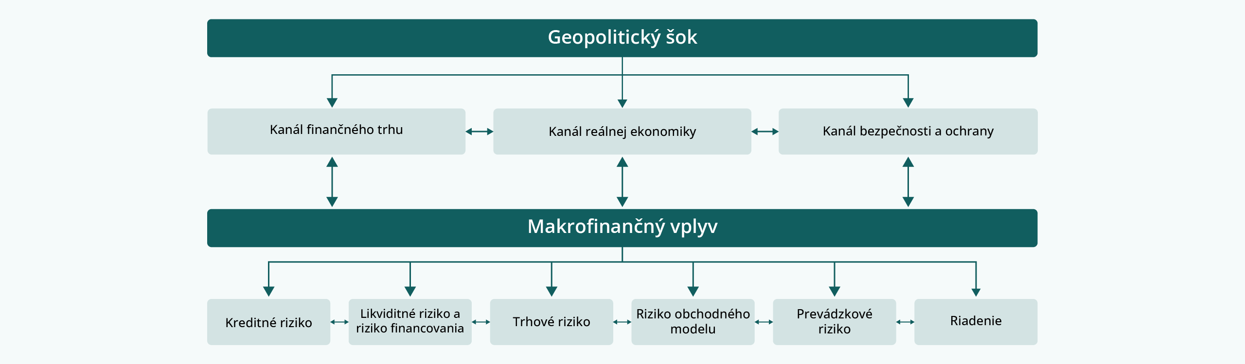 Geopolitické riziká sa môžu prejaviť ako kreditné, trhové a operačné riziko a riziko financovania. Geopolitické šoky sa môžu do bánk a ich prevádzkového prostredia prenášať rôznymi kanálmi: