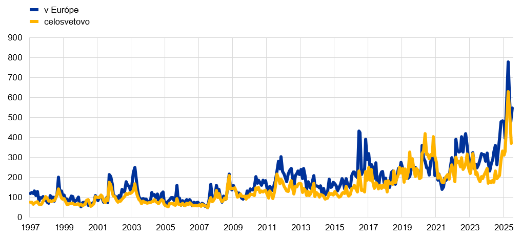 Poznámky: Ide o mediálny index, ktorý meria neistotu hospodárskej politiky na základe počtu novinových článkov obsahujúcich pojmy neistý alebo neistota, ekonomické alebo ekonomika a jeden alebo viacero politicky relevantných pojmov. Index neistoty európskej hospodárskej politiky vychádza z údajov za obdobie od januára 1997 do augusta 2025 a index neistoty svetovej hospodárskej politiky za obdobie od januára 1997 do júla 2025. Európsky index vychádza z denníkov publikovaných vo Francúzsku, Nemecku, Taliansku, Španielsku a Spojenom kráľovstve. Globálny index je priemerom národných indexov neistoty hospodárskej politiky váženým HDP (v bežných cenách) týchto krajín: Austrália, Brazília, Čile, Čína, Francúzsko, Grécko, India, Írsko, Japonsko, Južná Kórea, Kanada, Nemecko, Rusko, Spojené kráľovstvo, Spojené štáty, Španielsko, Švédsko a Taliansko.