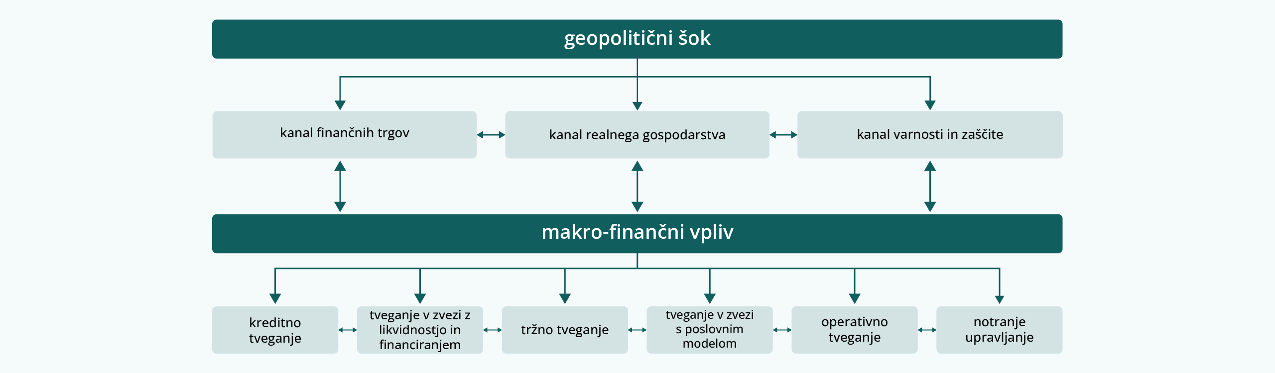 Geopolitična tveganja se lahko uresničijo kot kreditno, tržno in operativno tveganje ter kot tveganje pri financiranju. Geopolitični šoki se v banke in njihovo operativno okolje lahko prenašajo na različne načine.
