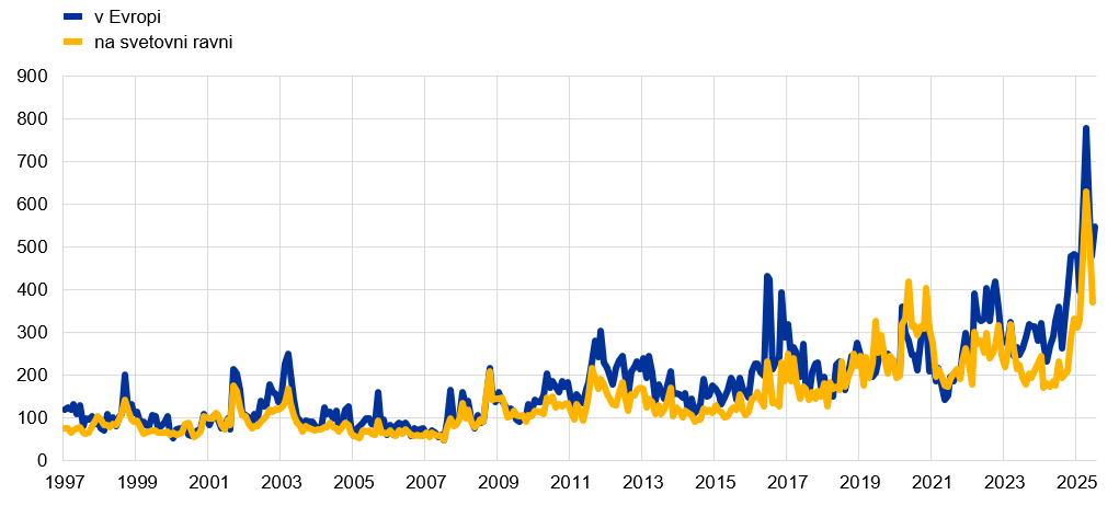 Opombe: Indeks temelji na novicah. Negotovost glede ekonomskih politik meri tako, da šteje časopisne članke, ki vsebujejo izraze negotov ali negotovost, gospodarski ali gospodarstvo ter enega ali več izrazov, povezanih z ekonomskimi politikami. Podatki so za obdobje od januarja 1997 do avgusta 2025 pri evropskem indeksu ter za obdobje od januarja 1997 do julija 2025 pri svetovnem indeksu. Evropski indeks temelji na časopisih v Franciji, Nemčiji, Italiji, Španiji in Združenem kraljestvu. Svetovni indeks je povprečje nacionalnih indeksov negotovosti glede ekonomskih politik, tehtano z BDP (v tekočih cenah), za: Avstralijo, Brazilijo, Kanado, Čile, Kitajsko, Francijo, Grčijo, Indijo, Irsko, Italijo, Japonsko, Rusijo, Južno Korejo, Španijo, Švedsko, Združeno kraljestvo in Združene države Amerike.