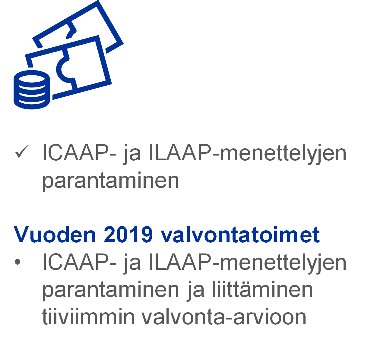 Valvontaprioriteetit on päivitetty ja niitä on selkeytetty näiden tärkeimpien riskitekijöiden pohjalta, jotta pankit voivat puuttua riskeihin tehokkaasti. Vuodelle 2019 on määritetty seuraavat valvonnan painopistealueet: