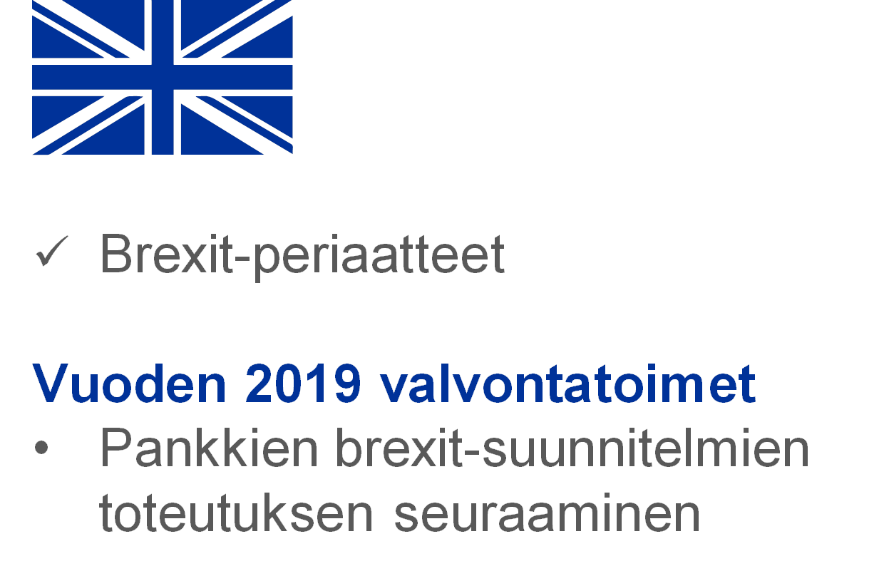 Yksi valvontatyön painopisteistä on edelleen pankkien valmistautuminen Ison-Britannian EU-eroon, jonka on määrä tapahtua maaliskuussa 2019. Valvojat seuraavat pankkien brexit-suunnitelmien toteutusta tarkasti varmistaakseen, että pankit toimivat valvontaodotusten mukaisesti. Työhön vaikuttanevat poliittisten neuvottelujen lopputulos ja päätös mahdollisesta siirtymäajasta. EKP on jatkuvan epävarmuuden vuoksi painottanut, että pankkien tulisi valmistautua kaikkiin mahdollisiin lopputuloksiin ja saattaa valmistelunsa päätökseen. Lisäksi EKP valmistautuu ottamaan suoraan valvontaansa useita uusia laitoksia, jotka todetaan merkittäviksi niiden siirtäessä brexitin myötä toimintansa Isosta-Britanniasta johonkin yhteiseen valvontamekanismiin osallistuvaan maahan.