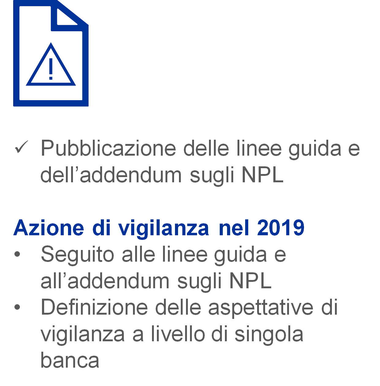 Il rischio di credito resta un’importante priorità di vigilanza per il 2019. Nonostante i progressi compiuti nella riduzione delle consistenze degli NPL nell’area dell’euro, il loro attuale livello aggregato rimane elevato rispetto agli standard internazionali. La Vigilanza bancaria della BCE continuerà ad affrontare il tema delle consistenze degli NPL e, sulla scorta del lavoro già svolto, si confronterà con gli enti interessati da tale fenomeno per definire aspettative di vigilanza a livello di singola banca nell’ambito di un quadro di riferimento armonizzato. L’obiettivo è assicurare progressi costanti nella riduzione dei rischi ereditati dal passato e conseguire un livello di copertura coerente per le consistenze e per i flussi di NPL in un orizzonte di medio termine.