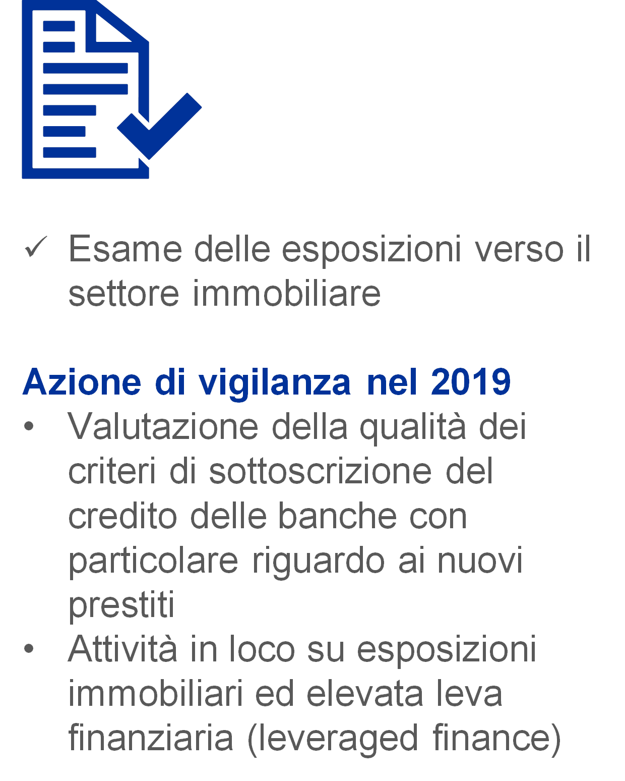 La Vigilanza bancaria della BCE valuterà la qualità dei criteri di sottoscrizione del credito adottati dalle banche con particolare riguardo ai nuovi prestiti. Sarà esaminata la qualità delle prassi creditizie e saranno analizzati i criteri per la concessione dei prestiti al fine di attenuare i potenziali rischi. Da tale attività potranno scaturire azioni specifiche indirizzate alla singola banca. Inoltre, la qualità di determinate classi di esposizioni sarà valutata tramite apposite ispezioni in loco su ambiti quali gli immobili residenziali e non residenziali e le attività caratterizzate da un grado elevato di leva finanziaria (leveraged finance).