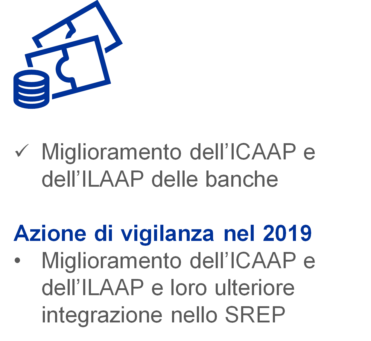 I processi interni di valutazione dell’adeguatezza patrimoniale (internal capital adequacy assessment process, ICAAP) e della liquidità (internal liquidity adequacy assessment process, ILAAP) rappresentano per gli enti creditizi strumenti essenziali di gestione del rischio. L’analisi della qualità di tali processi è condotta dalla Vigilanza bancaria della BCE quale componente fondamentale dello SREP. A partire dal 2019, dopo un intenso dialogo con le banche, saranno disponibili le versioni definitive delle guide della BCE sull’ICAAP e sull’ILAAP. Proseguiranno inoltre i lavori per accrescere la trasparenza riguardo alla composizione dei requisiti di secondo pilastro per tipologia di rischio.
