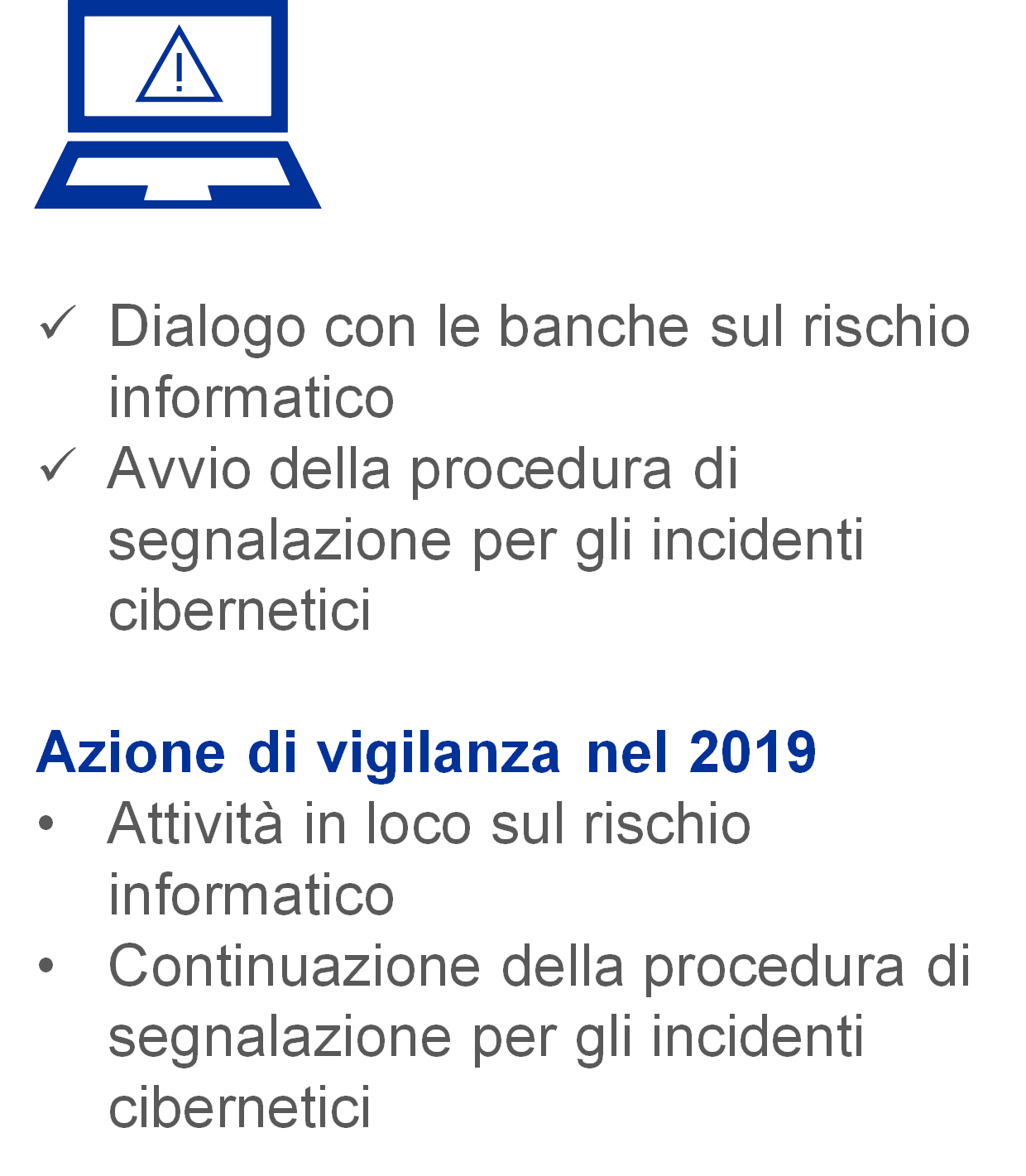 La Vigilanza bancaria della BCE seguiterà a valutare i rischi informatici e cibernetici e avvierà una serie di ispezioni in loco su tematiche legate al rischio informatico. In aggiunta, gli enti significativi continueranno a comunicare alla BCE ogni incidente cibernetico significativo tramite la relativa procedura di segnalazione dell’MVU.
