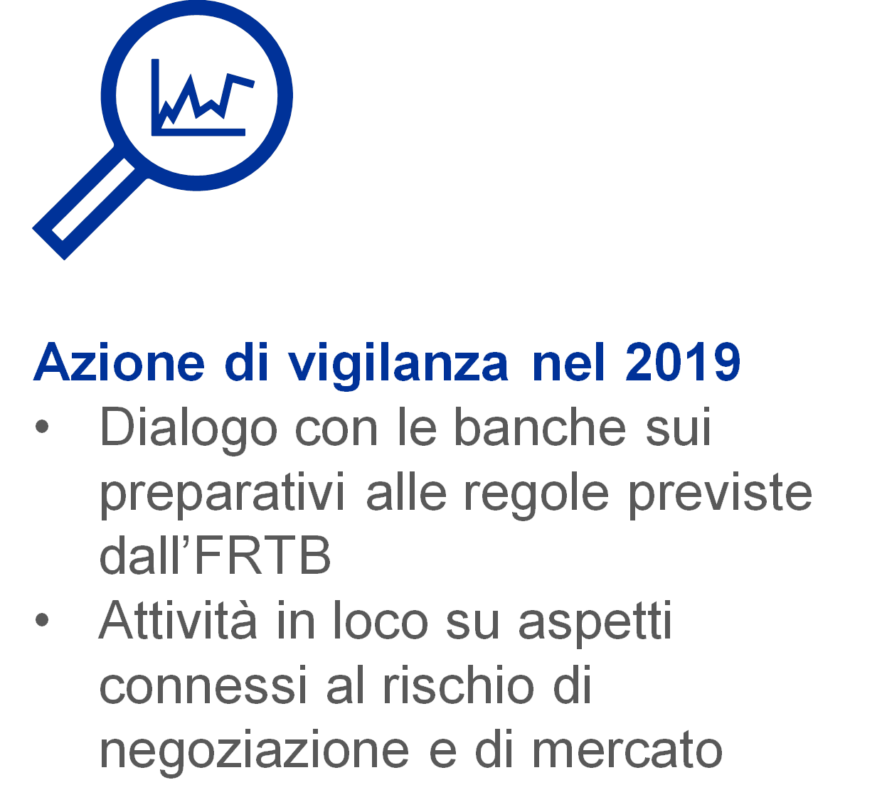 La Vigilanza bancaria della BCE proseguirà il dialogo di vigilanza con gli enti significativi per valutare il loro grado di preparazione alle regole previste dalla revisione complessiva del portafoglio di negoziazione (Fundamental Review of the Trading Book, FRTB). Tale confronto sarà teso ad assicurare che le banche rendano i loro sistemi adeguati al fine di conformarsi al nuovo quadro di riferimento per il rischio di mercato. Sono inoltre in programma diverse missioni in loco focalizzate nello specifico su aspetti riguardanti il rischio di negoziazione e di mercato. In tale contesto, i GVC potrebbero condurre verifiche approfondite iniziali presso determinate banche al fine di adeguare l’ambito di indagine delle missioni in loco alle aree di rischio pertinenti.
