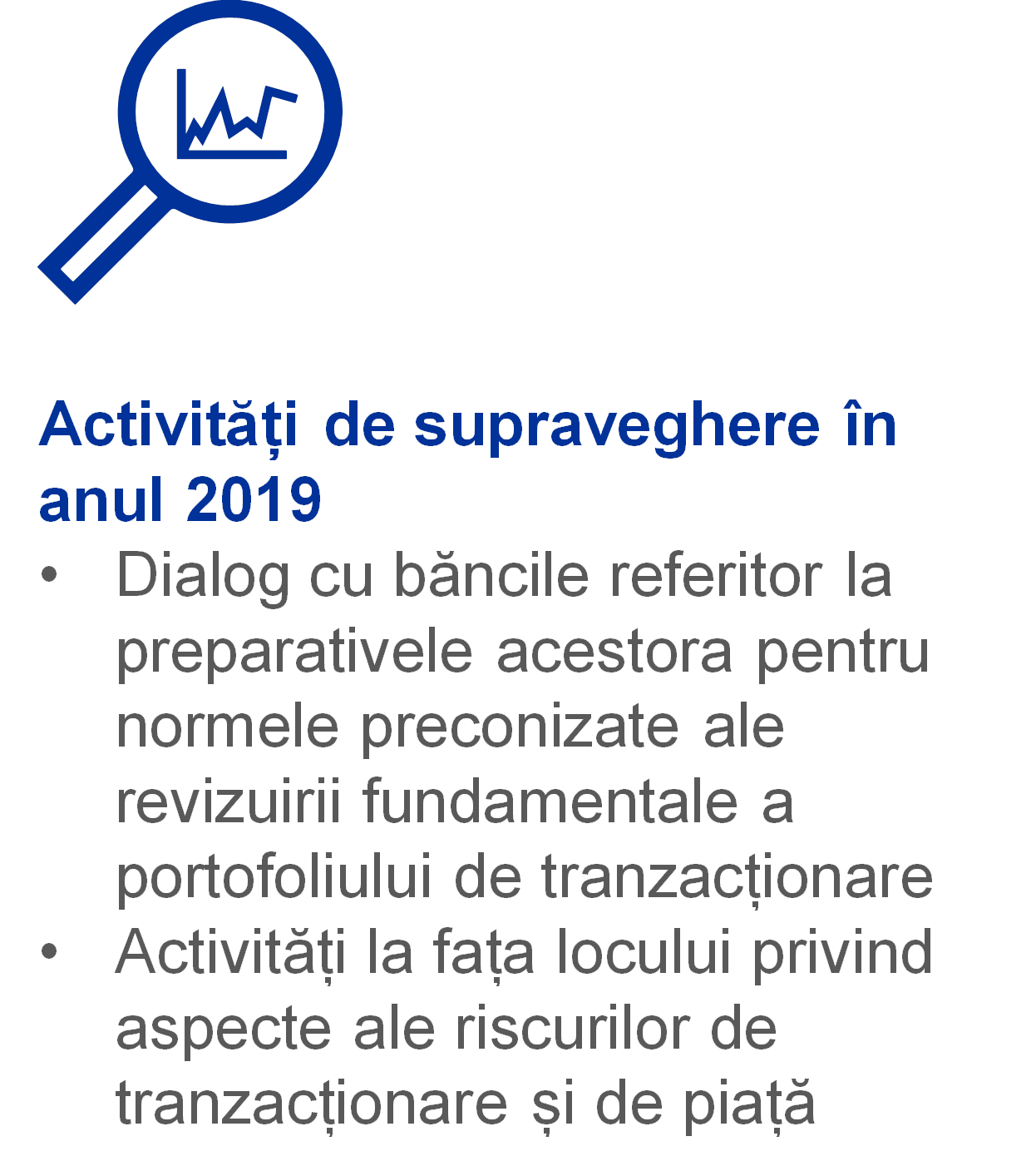 Supravegherea bancară a BCE va continua dialogul de supraveghere cu instituțiile semnificative în vederea evaluării stadiului de pregătire a acestora pentru normele preconizate ale revizuirii fundamentale a portofoliului de tranzacționare. Acest dialog va urmări să asigure că băncile își pregătesc în mod adecvat sistemele în vederea conformării la noul cadru privind riscul de piață. Sunt, de asemenea, planificate o serie de misiuni la fața locului, cu un accent sporit pe aspecte legate de riscul de tranzacționare și riscul de piață. În acest context, ECS pot efectua în avans analize foarte aprofundate la bănci selectate în vederea adaptării sferei de aplicare a misiunilor la fața locului la domeniile de risc relevante.