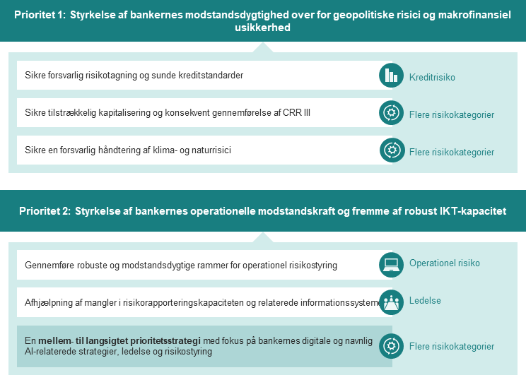 På baggrund af disse udfordrende udsigter afspejler tilsynsprioriteterne for 2026-28 behovet for, at bankerne forbliver modstandsdygtige over for geopolitiske risici og makrofinansiel usikkerhed (prioritet 1), samtidig med at der sikres stærk operationel modstandsdygtighed og IKT-kapacitet (prioritet 2).