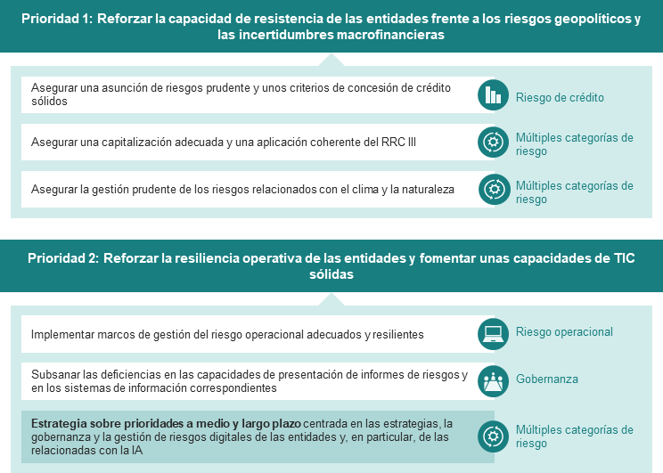 Teniendo en cuenta estas difíciles perspectivas, las prioridades supervisoras para 2026-2028 reflejan la necesidad de que las entidades mantengan su capacidad de resistencia frente a los riesgos geopolíticos y las incertidumbres macrofinancieras (Prioridad 1), y aseguren al mismo tiempo resiliencia operativa y capacidades de TIC sólidas (Prioridad 2).