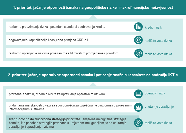 Imajući u vidu te nepovoljne izglede, nadzorni prioriteti za razdoblje od 2026. do 2028. proizlaze iz potrebe da banke ostanu otporne u okružju geopolitičkih rizika i makrofinancijske neizvjesnosti (1. prioritet), uz istodobno postizanje snažne operativne otpornosti i kapaciteta na području IKT‑a (2. prioritet).