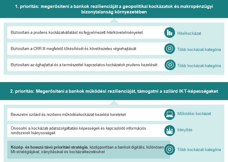 A jelenlegi makropénzügyi és geopolitikai környezet alapján erős pénzügyi rezilienciára van szükség az európai bankszektorban, ami bizonyos területeken fokozott felügyeleti figyelmet igényel. A bankoknak gondoskodniuk kell a különösen körültekintő kockázatvállalásról és megbízható hitelkövetelményekről, hogy megelőzzék az új nemteljesítő hitelek felhalmozódását. Emellett a felügyeletek gondosan figyelik, hogyan alkalmazzák a bankok az új, kockázatérzékenyebb sztenderdizált módszertanokat, amelyek célja a CRR III/CRD VI banki csomag szerinti tőkekövetelmények kiszámításának segítése. Az új tőkekövetelmény-keretek jobban hozzáigazítják a tőkekövetelményeket a bankok tényleges kockázataihoz, és a kockázattal súlyozott eszközök kiszámítására gyakorolt hatásuk idővel várhatóan növekedni fog, ahogy az új alsó kibocsátási korlát bevezetésre kerül. Végezetül, az éghajlati katasztrófák növekvő gyakorisága és a Párizsi Megállapodás szerinti nulla nettó célok lassú megvalósítása miatt a bankoknak tovább kell erősíteniük a klímával és a természettel kapcsolatos (K+T) kockázatok kezelését.