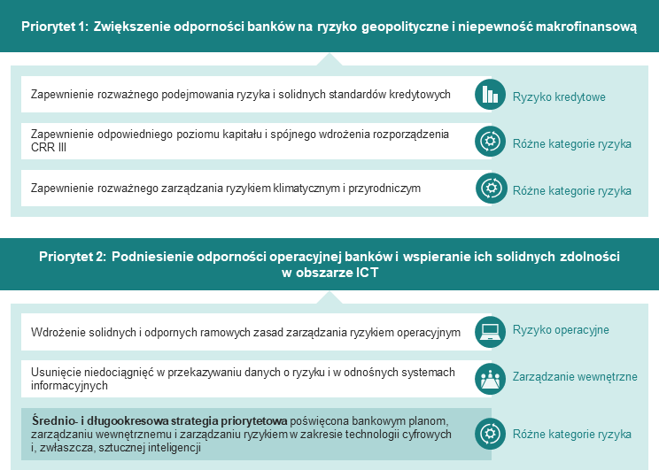 Biorąc pod uwagę te trudne perspektywy, priorytety nadzorcze na lata 2026–2028 odzwierciedlają konieczność zachowania przez banki odporności na ryzyko geopolityczne i niepewność makrofinansową (priorytet 1), przy jednoczesnym zapewnieniu ich dużej odporności operacyjnej i solidnych zdolności w obszarze ICT (priorytet 2).