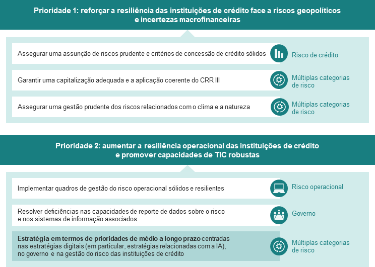 À luz destas perspetivas difíceis, as prioridades prudenciais no período de 2026 a 2028 refletem a necessidade de as instituições de crédito permanecerem resilientes face a riscos geopolíticos e incertezas macrofinanceiras (prioridade 1), assegurando simultaneamente uma resiliência operacional sólida e capacidades de tecnologias de informação e comunicação (TIC) fortes (prioridade 2).