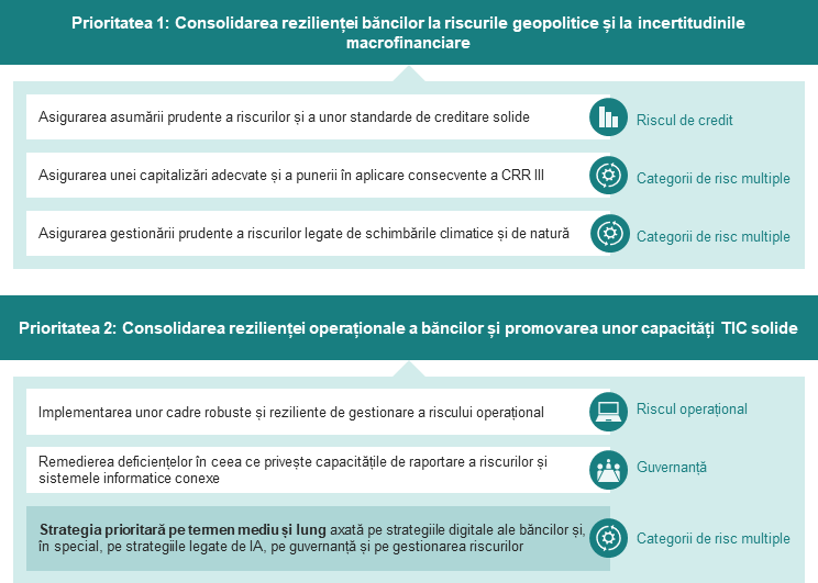 Având în vedere aceste perspective dificile, prioritățile în materie de supraveghere pentru perioada 2026-2028 reflectă necesitatea ca băncile să rămână reziliente pentru a face față riscurilor geopolitice și incertitudinilor macrofinanciare (prioritatea 1), concomitent cu asigurarea unei reziliențe operaționale și a unor capacități TIC solide (prioritatea 2).
