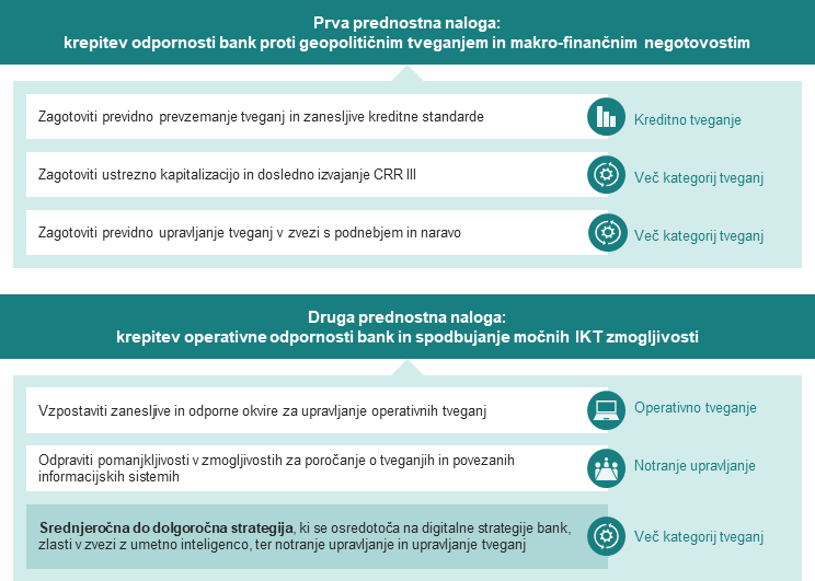 V sedanjem makro-finančnem in geopolitičnem okolju mora biti evropski bančni sektor zelo finančno odporen, kar terja večjo pozornost nadzornikov na izbranih področjih. Tako bi morale banke zagotoviti previdno prevzemanje tveganj in zanesljive kreditne standarde, da bi preprečile kopičenje novih nedonosnih posojil. Poleg tega bodo nadzorniki pozorno spremljali, kako banke izvajajo nove standardizirane pristope, ki so bolj občutljivi na tveganja, njihov namen pa je pomagati pri izračunu kapitalskih zahtev v skladu z bančnim svežnjem CRR III/CRD VI. Novi okvir kapitalskih zahtev bolje usklajuje kapitalske zahteve z dejanskimi tveganji v bankah, vpliv na izračun tveganju prilagojene aktive pa naj bi se sčasoma povečeval s postopnim uvajanjem novega izstopnega praga. Vse pogostejše podnebne katastrofe in počasen napredek v ogljično nevtralno gospodarstvo v skladu s Pariškim sporazumom od bank terjajo, da dodatno okrepijo upravljanje tveganj v zvezi s podnebjem in naravo.