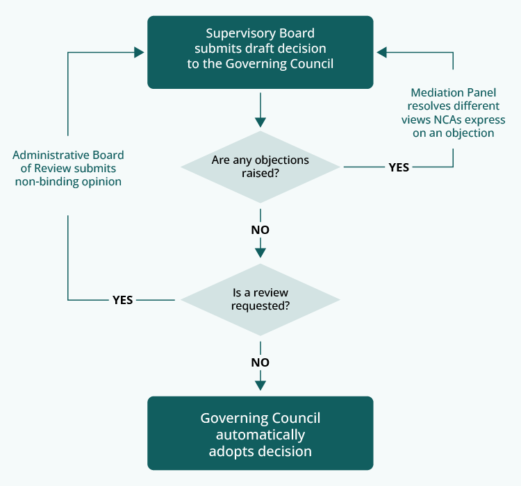 The Supervisory Board prepares draft decisions, which are then adopted by the Governing Council under a non-objection procedure. If the Governing Council does not object within a defined period of time, the decision is deemed adopted.