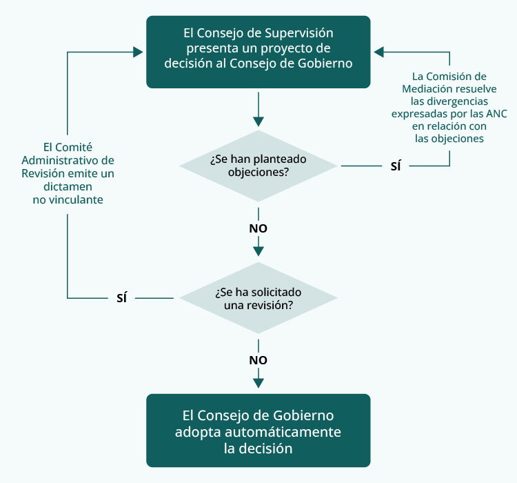 El Consejo de Supervisión elabora proyectos de decisiones, que son adoptadas por el Consejo de Gobierno de acuerdo con el procedimiento de no oposición. Si el Consejo de Gobierno no opone objeciones en un plazo determinado, se entiende que la decisión ha sido adoptada.