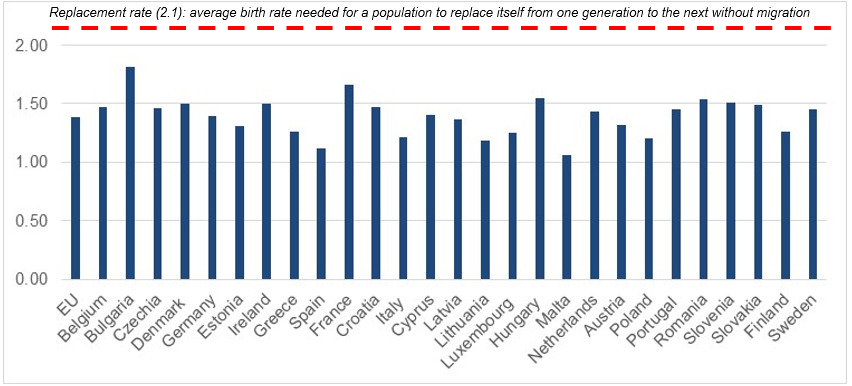 Note: All EU countries display an average birth rate below the population replacement rate.