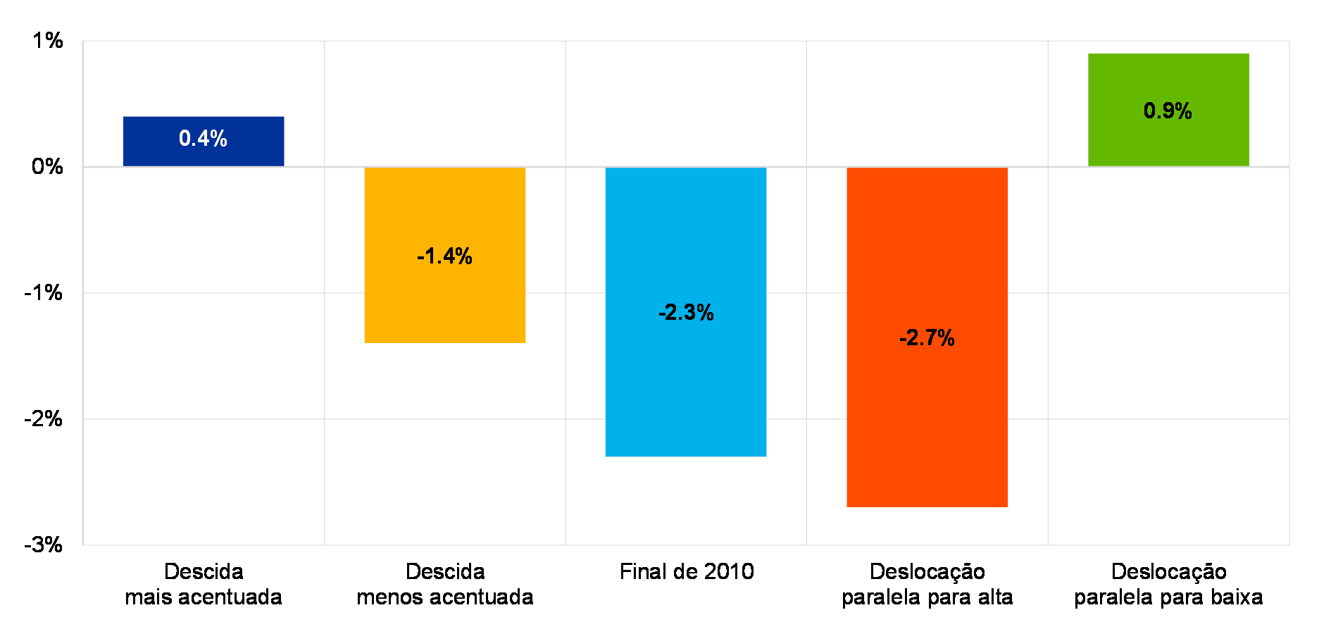 Notas: Valores baseados nas projeções da margem financeira agregadas para todas as moedas importantes testadas no exercício e para as 111 entidades. As deslocações paralelas são atualmente utilizadas no processo de reporte do risco de taxa de juro da carteira bancária (+/- 200 pontos base para posições em euros); as descidas mais e menos acentuadas baseiam-se nas normas recentes do Comité de Basileia de Supervisão Bancária para o risco de taxa de juro da carteira bancária; o choque do final de 2010 considera o regresso das taxas de juro a níveis observados pela última vez em 2010, e o choque do final de 2016 mantém as taxas de juro constantes nos níveis verificados no fim de 2016.
