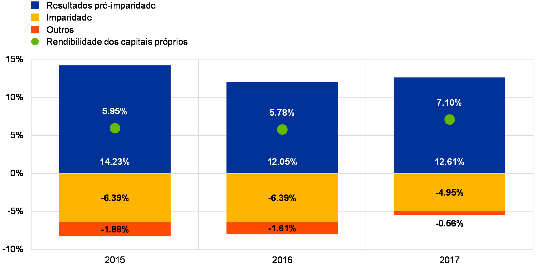 Tendo 2016 sido um ano particularmente difícil para as instituições de crédito da área do euro, em 2017, a situação melhorou um pouco. Nos primeiros três trimestres de 2016, os resultados pré-imparidade das instituições significativas diminuíram 10% em comparação com os três primeiros trimestres de 2015. Nos primeiros nove meses de 2017, observou-se, então, uma recuperação dos resultados pré-imparidade (+2%). A par de uma forte diminuição da imparidade (‑14.9% em comparação com 2016, -35.2% em comparação com 2015), tal resultou numa melhoria relativa da rendibilidade dos capitais próprios (Return on Equity – RoE) anualizada das instituições significativas, que se situou, em média, em 7.0%, face a 5.4% em 2016 e 5.7% em 2015.