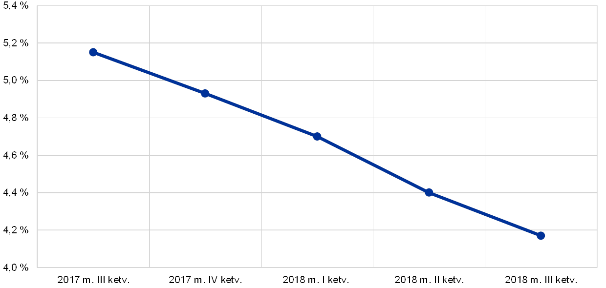 Bankų turto kokybė irgi gerėja, nes mažėja bendras neveiksnių paskolų rodiklis – nuo 5,15 %, buvusio 2017 m. trečiąjį ketvirtį, jis sumažėjo iki 4,17 % (žr. 13 pav.).