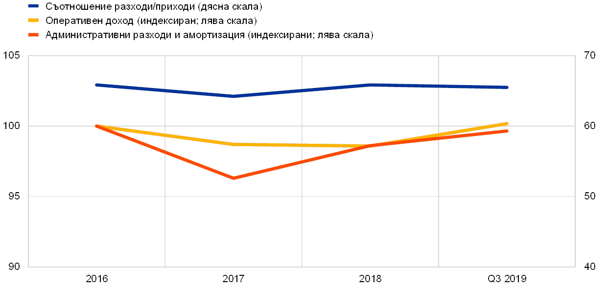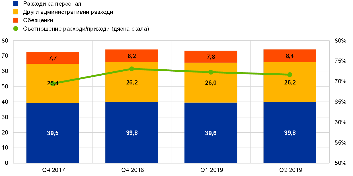 Съотношението разходи/приходи на значимите институции остана сравнително високо (вж. Графика 10) в отражение не само на неефективните разходи, но и на разходи за преструктуриране и разходи, свързани с инвестиции в цифровизиране. В средносрочен план цифровизацията може да подобри разходната ефективност и да даде възможност на банките да предлагат нови продукти и услуги. Тя също така е важна за устойчивостта на бизнес моделите, но същевременно налага начални разходи, докато ползите се реализират едва с течение на времето.