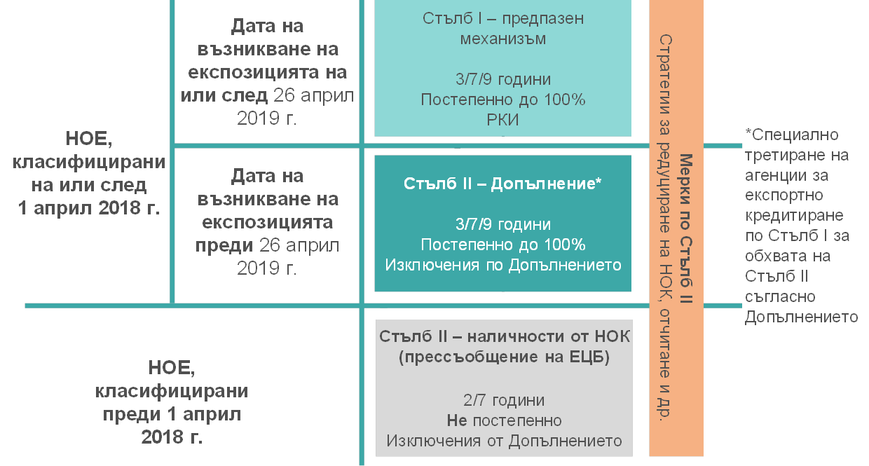 - Премахва се очакваният линеен път към пълно прилагане за частите от НОЕ, които са гарантирани или застраховани от официална агенция за експортно кредитиране, т.е. съгласно третирането на НОЕ по Стълб І няма очакване за покритие до 7-годишна продължителност на необслужването, а очакването за 100% покритие е приложимо за експозиции на експортни кредити след повече от 7-годишно състояние на необслужване.