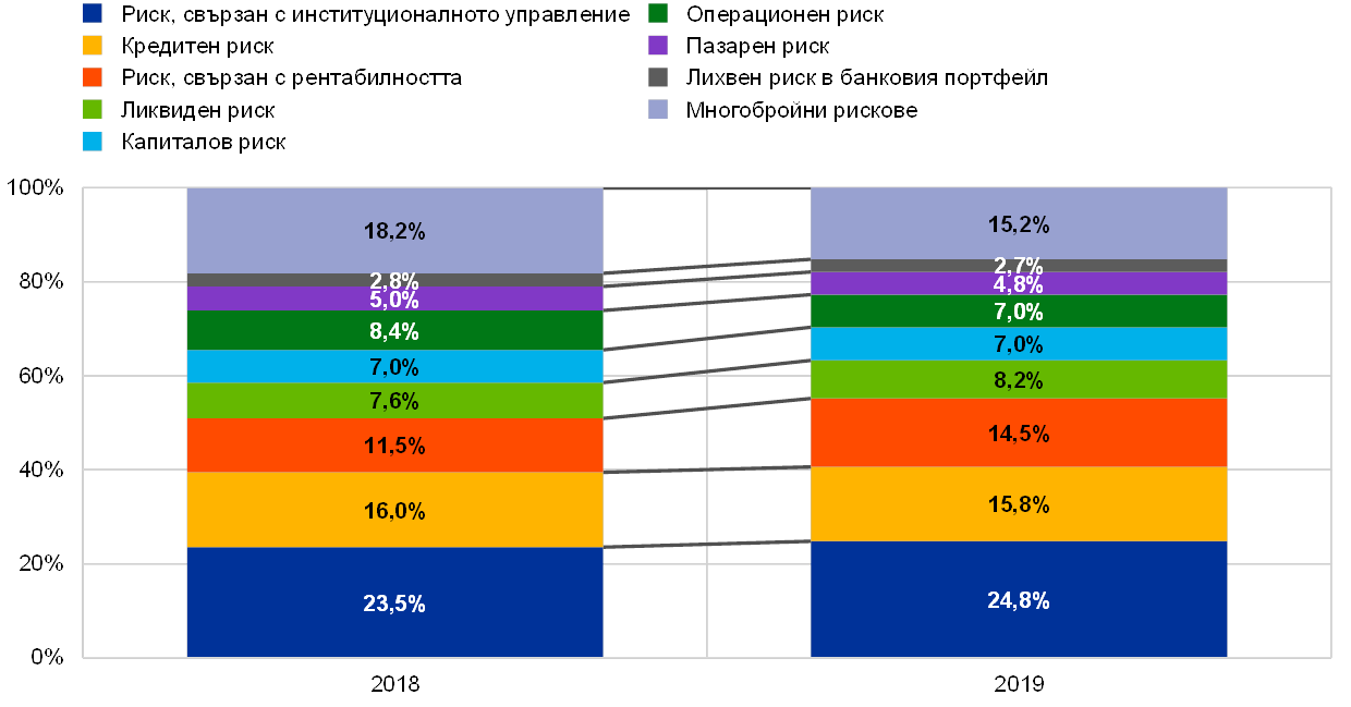 В оценките ни много често се определят като проблемна област въпроси, свързани с институционалното управление. Най-добрите практики започват с това схемите за възнаграждение да са в съответствие със склонността на банката към поемане на риск и продължават чак до предоставянето на ръководния орган на точни и своевременни данни за рисковете. Освен това, като се имат предвид няколко нашумели в последно време случая, мерките за контрол и процедурите срещу изпирането на пари все още са недостатъчни. Нека да е ясно, ние очакваме всички банки да имат силно институционално управление и ефикасни рамки за управление на рисковете. Проблемите в тези области се разпространяват бързо и могат да причинят много неприятности. Добър пример е операционният риск. Тук положението се влоши през 2019 г., като повечето загуби от операционен риск бяха предизвикани от риска от неправомерни действия, който често е свързан с проблеми в институционалното управление. Друг източник на операционен риск са информационните технологии. С нарастващото цифровизиране на банките те стават по-изложени на киберрискове – или на генерични ИТ рискове, произтичащи например от това, че системите са остарели. Ние гледаме много сериозно на този въпрос и провеждаме редица проверки на място, съсредоточени върху информационните технологии.