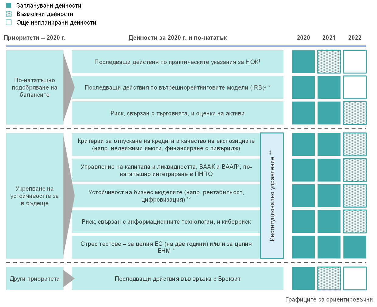 Въпреки значителните усилия на надзорните органи през последните години през 2020 г. все още ни очакват предизвикателства, които изискват по-решителни действия от страна на банките. Тяхната рентабилност остава ниска и ако това продължи твърде дълго, може да засегне устойчивостта на банковия сектор като цяло. Част от решението е да се намали излишният капацитет, да се редуцират оставащите наличности от необслужвани кредити и да се приспособят бизнес моделите и стандартите в информационните технологии към цифровата епоха.