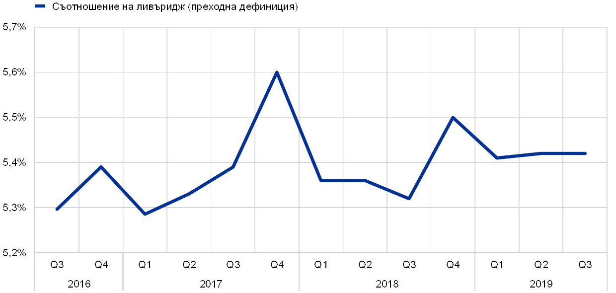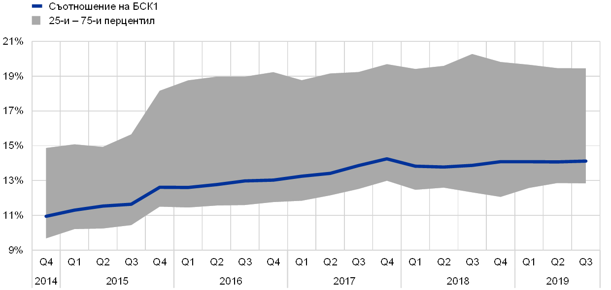 Между четвъртото тримесечие на 2018 г. и третото тримесечие на 2019 г. претегленото средно съотношение на изцяло въведения БСК1 на значимите институции остана стабилно на равнище 14,1% (вж. Графика 2). Съотношението на ливъридж леко се повиши през първите три тримесечия на 2019 г. до 5,42% през третото тримесечие в сравнение с 5,32% година по-рано (вж. Графика 3).